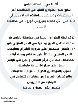 لجنة الطوارئ العليا في محافظة نابلس تنفي تسجيل أي إصابات بفيروس كورونا في نابلس وتعلن عن حجر 177 شخصاً في منازلهم.