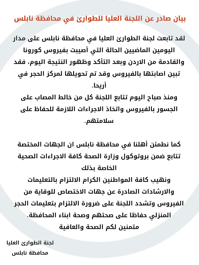 لجنة الطوارئ العليا في محافظة نابلس تصدر بيانا بخصوص الحالة المصابة بفيروس كورونا من نابلس والتي تم الكشف عنها على الجسر. يشار إلى أن المصاب لم يدخل نابلس منذ عودته عبر الجسر.