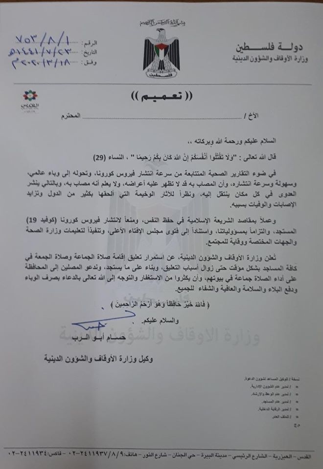 وزارة الأوقاف والشؤون الدينية تعلن عن استمرار تعليق إقامة صلاة الجماعة وصلاة الجمعة في كافة المساجد بشكل مؤقت وتدعو المواطنين للصلاة في بيوتهم.