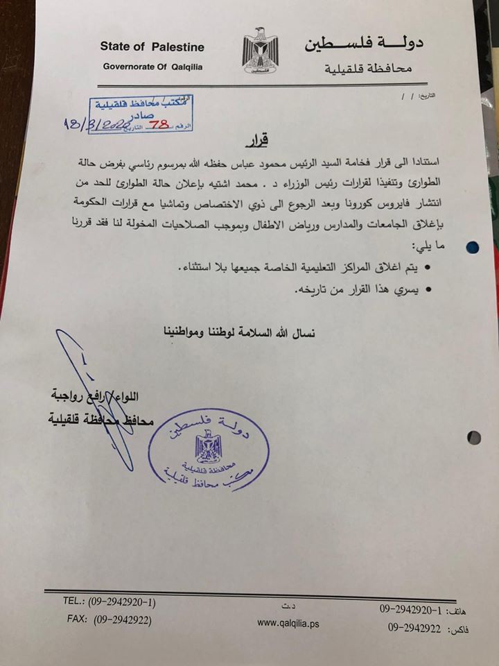 محافظة قلقيلية تعلن عن إغلاق كافة المراكز التعليمية الخاصة تماشيا مع قرار الحكومة بإغلاق الجامعات والمدراس ورياض الأطفال للوقاية من فيروس كورونا.