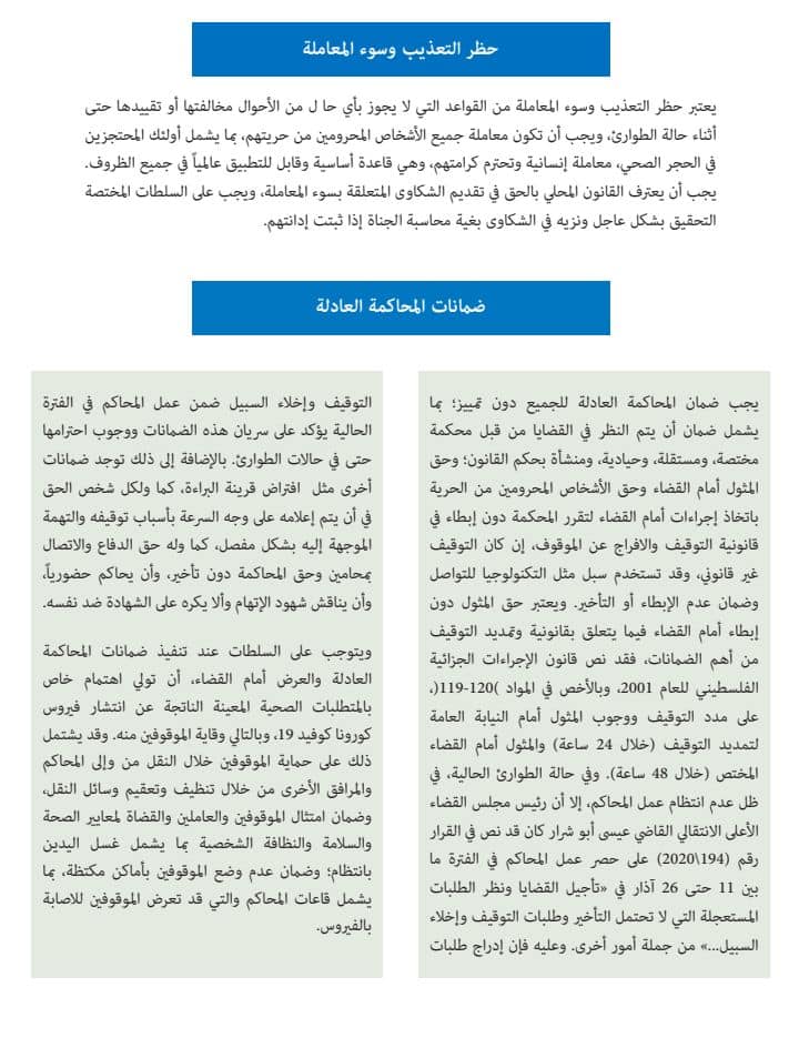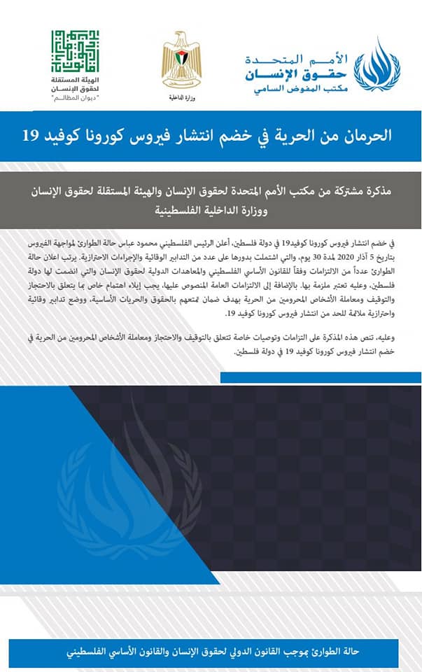 مكتب الأمم المتحدة لحقوق الإنسان والهيئة المستقلة لحقوق الإنسان ووزارة الداخلية الفلسطينية يصدرون مذكرة مشتركة بعنوان الحرمان من الحرية في خضم انتشار فيروس كورونا.