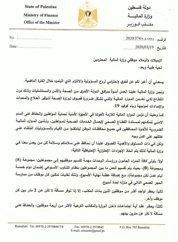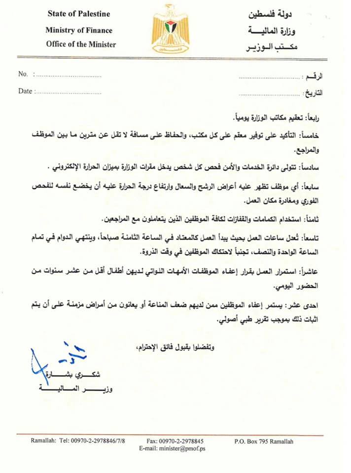 وزارة المالية تقر عدة إجراءات وقائية لمنع تفشي فيروس كورونا ومنها تعديل ساعات الدوام.