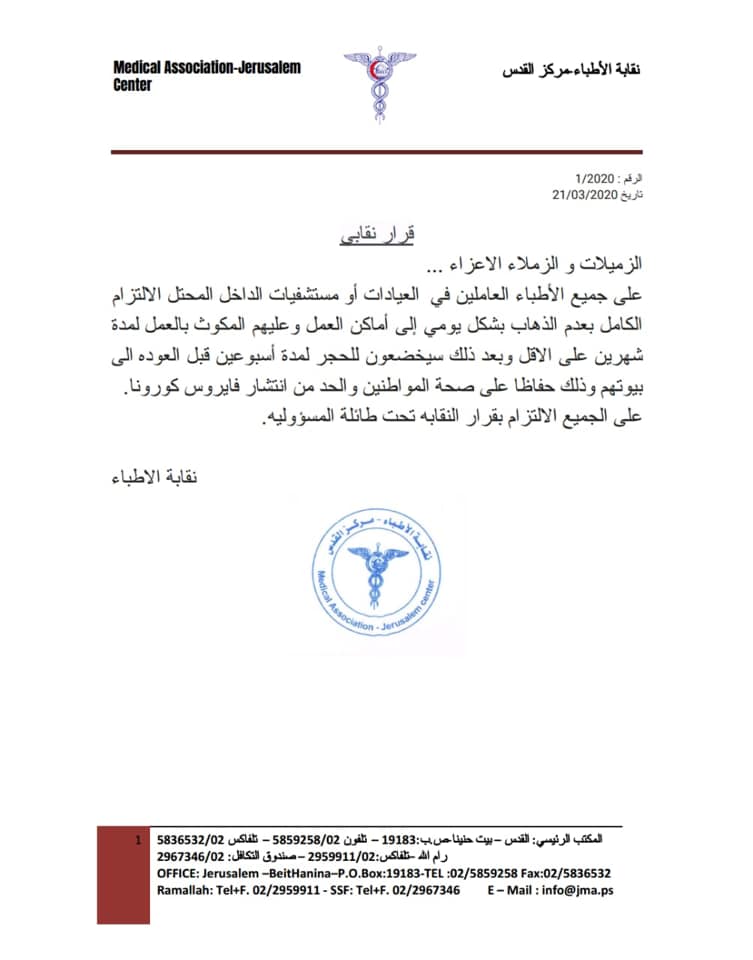 نقابة الأطباء تصدر قرارا يفرض الحجر على الأطباء الذين يعملون في المستشفيات في إسرائيل للوقاية من كورونا.