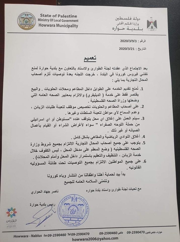 لجنة الطوارئ بالتعاون مع بلدية حوارة تصدر عدة توصيات لأصحاب المحال التجارية تحت طائلة المسؤولية.