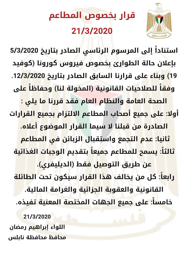 محافظة نابلس تصدر قرارات بخصوص المطاعم في ظل حالة الطوارئ المعلنة وتمنع استقبال وتجمع الزبائن في المطاعم وتسمح بتوصيل الطعام فقط.