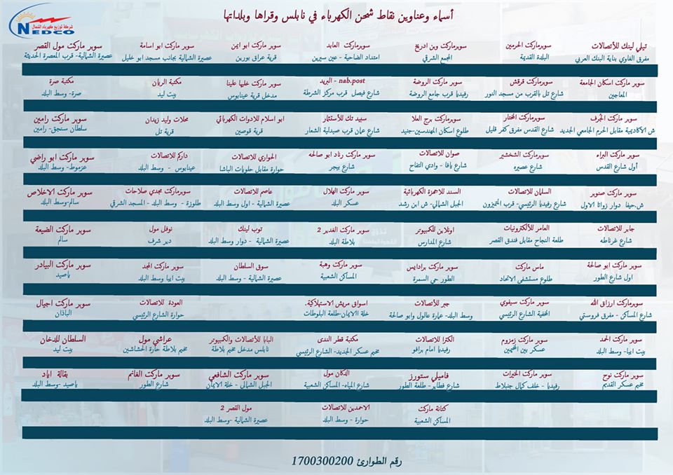 شركة توزيع كهرباء الشمال تنشر نقاط شحن الكهرباء في مدينة نابلس وقراها وضواحيها.