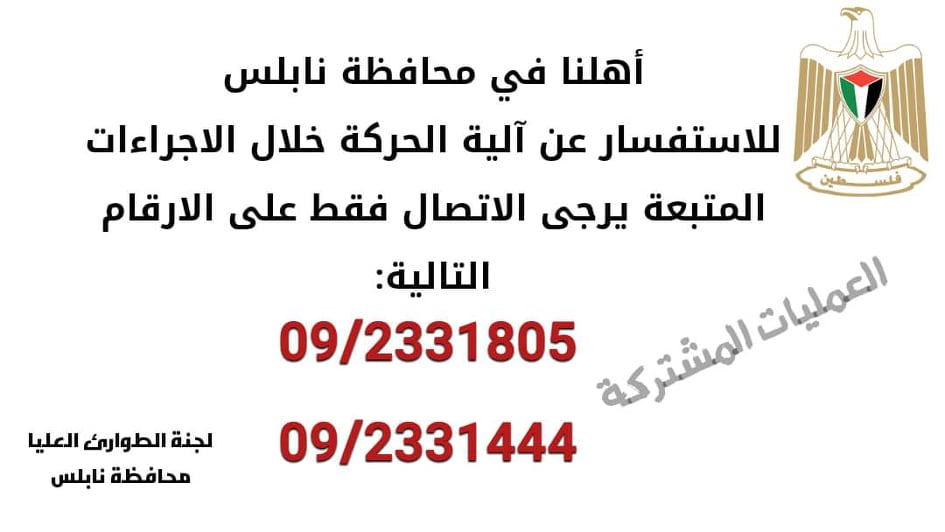 محافظة نابلس تعلن أرقام التواصل للاستفسار بخصوص الحركة خلال حالة الطوارئ.