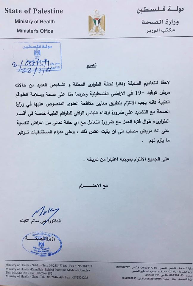 وزارة الصحة تدعو الطواقم الطبية لاتباع تعليمات الوقاية خلال تعاملهم مع المصابين بفيروس كورونا.