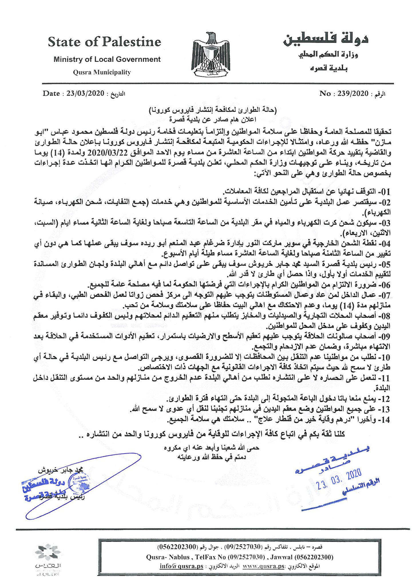 بلدية قصرة تصدر إعلانا بخصوص حالة الطوارئ والحجر الإلزامي وتعلن عن مواعيد شحن الكهرباء والمياه.