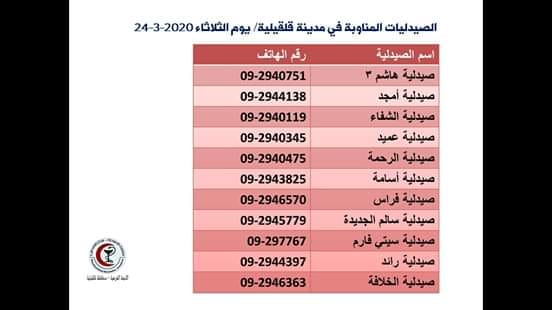 أرقام هواتف وجدول مناوبات صيدليات مدينة قلقيلية ليوم الثلاثاء 24.03.2020، في حالة الطوارئ والحجر الإلزامي.