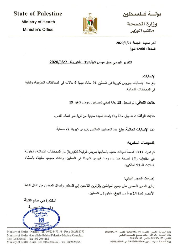 وزارة الصحة تعلن عن آخر المستجدات بخصوص فيروس كورونا وتعلن ارتفاع عدد حالات الشفاء من كورونا إلى 18 حالة وإجراء 5217 فحصا لعينات يشتبه بإصابتها والنتيجة خلوها من المرض.