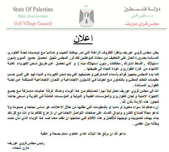 مجلس قروي عوريف يعلن عن تأجيل تحصيل الديون خلال الطوارئ.