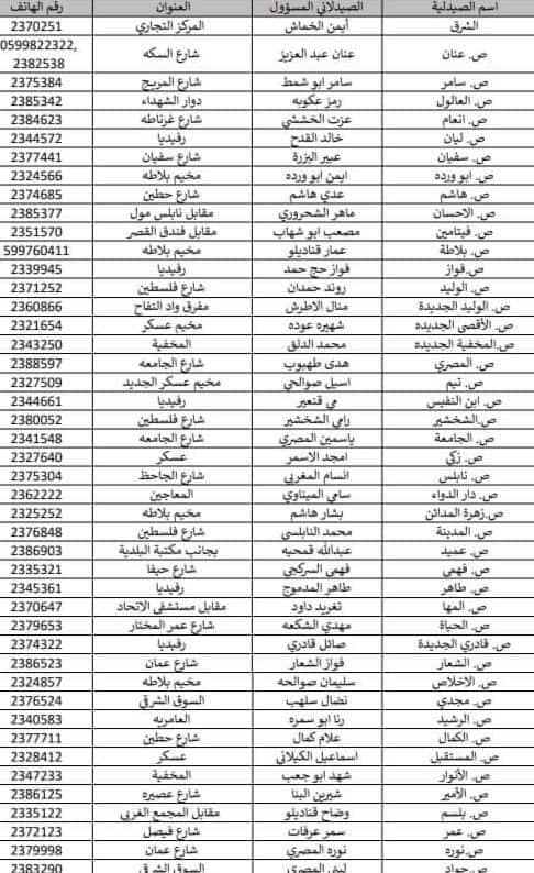 أسماء وأرقام هواتف الصيدليات المناوبة في نابلس وضواحيها خلال فترة الطوارئ.