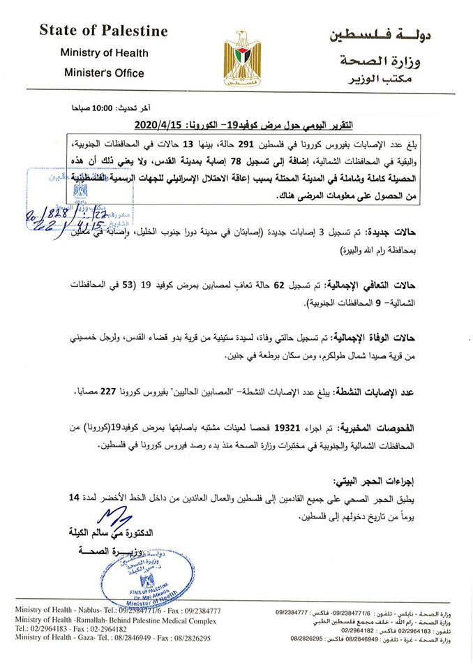 وزارة الصحة تنشر تقريرها اليومي بخصوص المستجدات حول فيروس كروونا في فلسطين وتؤكد تسجيلها 62 حالة تعافي من الفيروس.