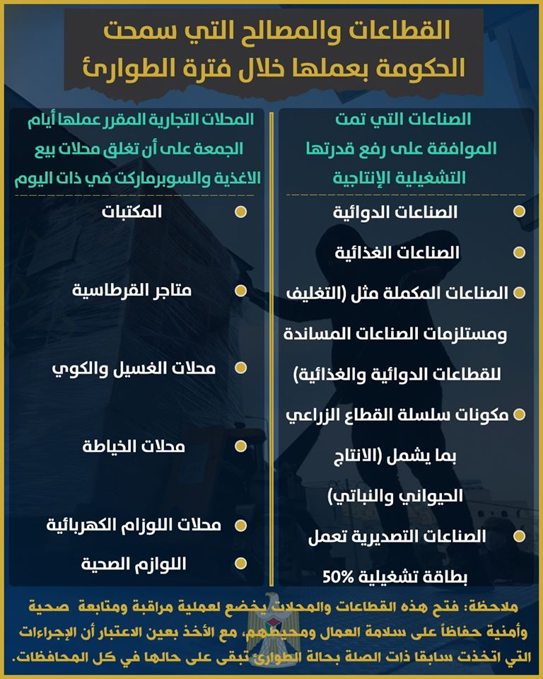 أوضح رئيس الوزراء محمد اشتية من خلال صفحته على الفيسبوك، المعيار الأساسي الذي اتخذته الحكومة بالحسبان أثناء نقاشاتها للسماح لبعض المصالح بالعمل وفق القيود المعلنة، قائلا: "هو الصحة والسلامة العامة أولا، بحيث يسمح بالعمل لكل من: