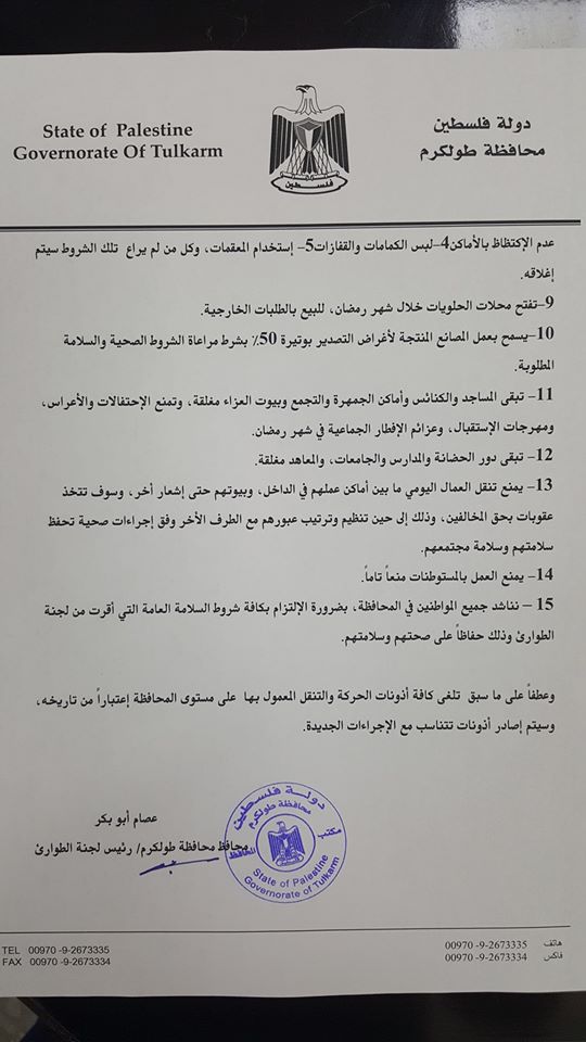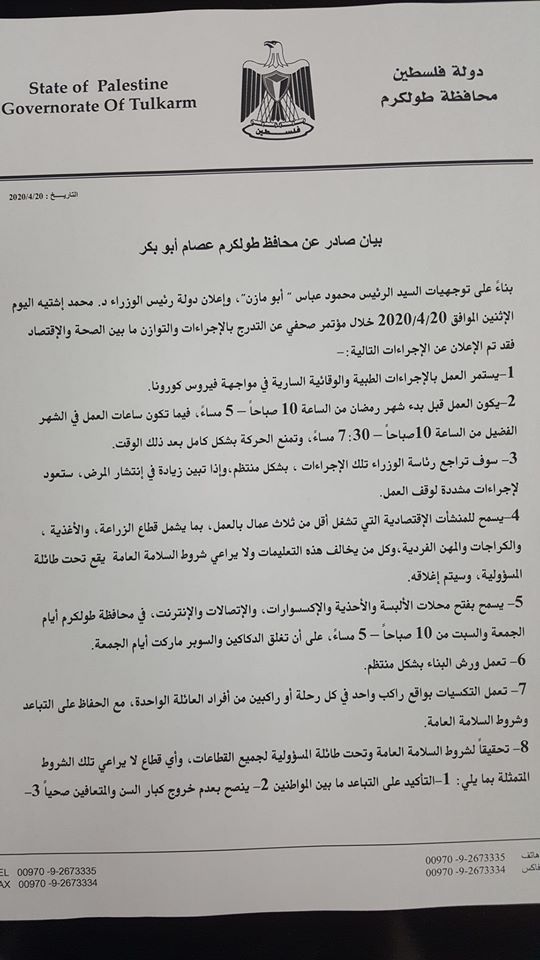 محافظة طولكرم تعلن عن تسهيلات جديدة تبعا لقرار الحكومة الفلسطينية خلال الطوارئ.