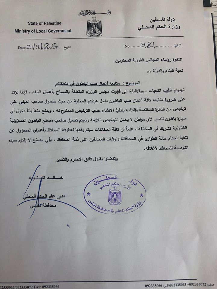 مديرية الحكم المحلي في نابلس تؤكد على ضرورة متابعة كافة أعمال صب الباطون في المحافظة وذلك حسب التراخيص الممنوحة.