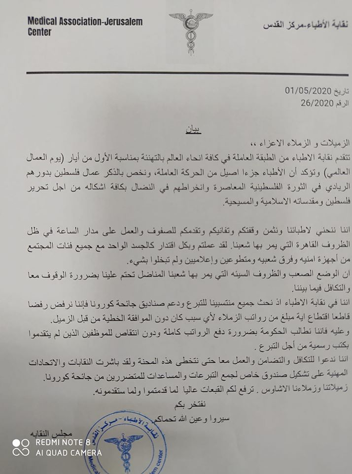 جدل واسع أثارته توصية رئيس الوزراء محمد اشتية باقتطاع جزء من رواتب الموظفين الرسميين لصالح التبرعات، نقابة الأطباء تصدر بيانا ترفض فيه الاقتطاع وتحث على التبرع.