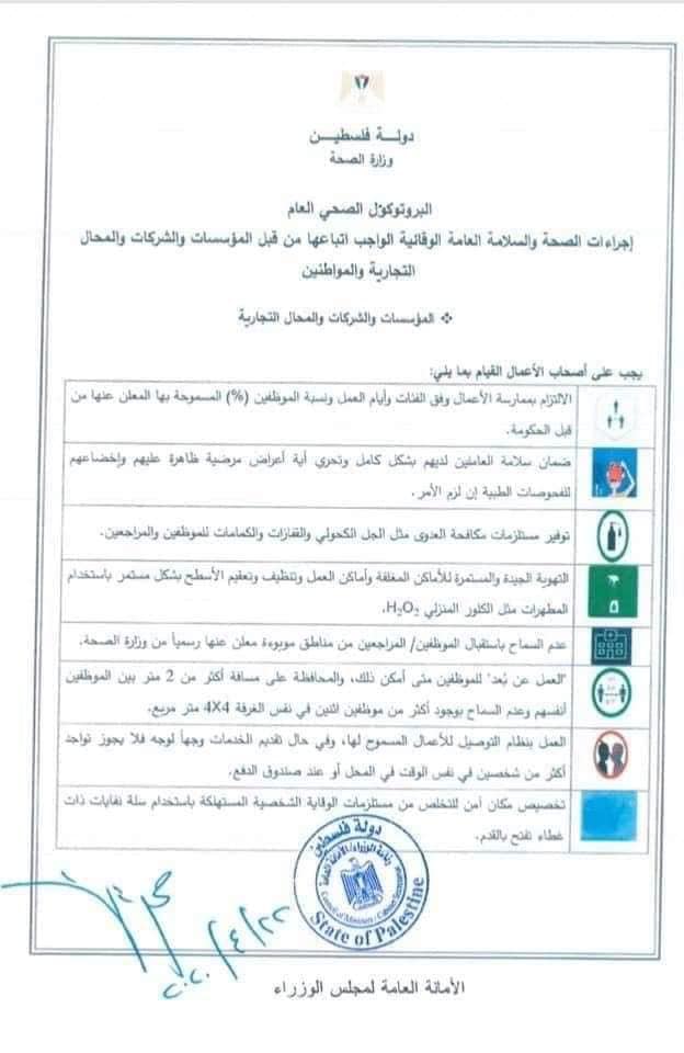 وزارة الاقتصاد تنشر البروتوكول الصحي العام لعمل القطاعات الصناعية وإجراءات الصحة والسلامة العامة الوقائية الواجب اتباعها من قبل المؤسسات والشركات والمحال التجارية والمواطنين.