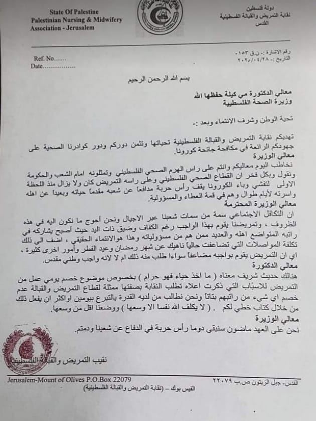 نقابة التمريض والقبالة الفلسطينية تصدر بيانا تطالب فيه وزيرة الصحة بعدم الخصم من رواتبهم.