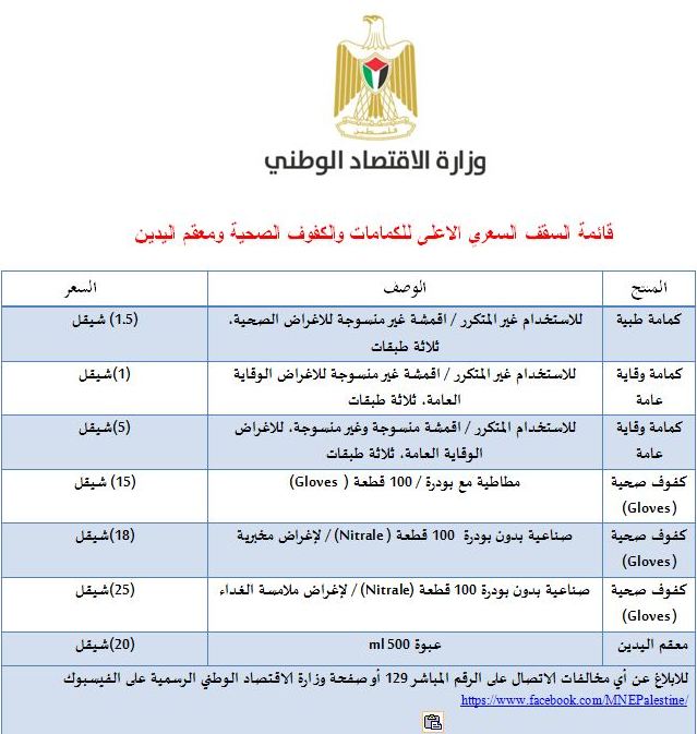 حددت وزارتا الاقتصاد والصحة قائمة السقف السعري الأعلى للكمامات والكفوف الصحية ومعقم اليدين، المعتمدة من قبل مؤسسة المواصفات والمقاييس الفلسطينية.