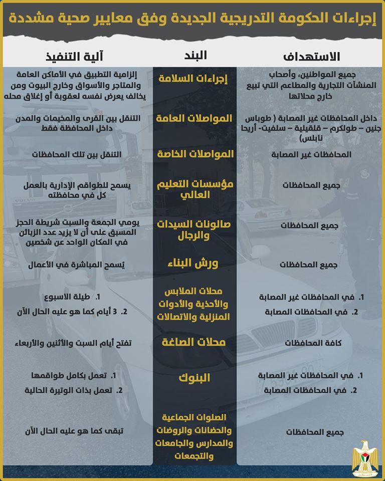 نشر رئيس الوزراء محمد اشتية آلية الحكومة في اتباع الإجراءات والتسهيلات الجديدة تدريجيا وفق معايير صحية مشددة، قائلا: