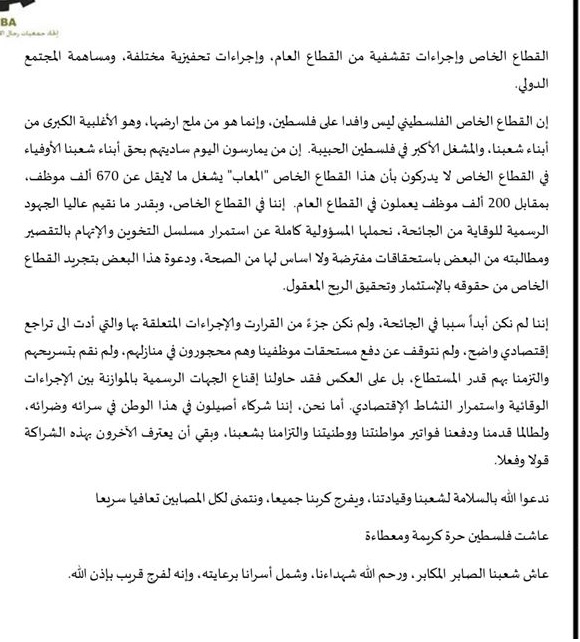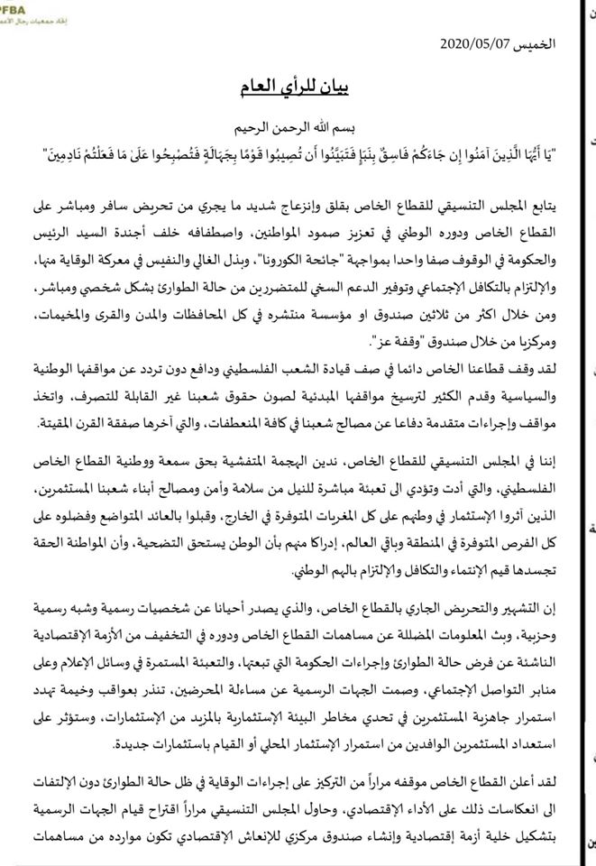 القطاع الخاص يصدر بيانا يستنكر فيه قيام حتى بعض الشخصيات الرسمية وغير الرسمية بالتحريض ضد القطاع الخاص ودوره في توفير الدعم للمتضررين منذ تفشي فيروس كورونا.