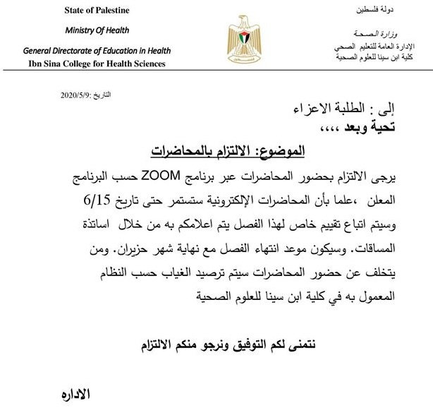 كلية ابن سينا للعلوم الصحية تدعو للالتزام بالمحاضرات عبر تقنية zoom خلال حالة الطوارئ.