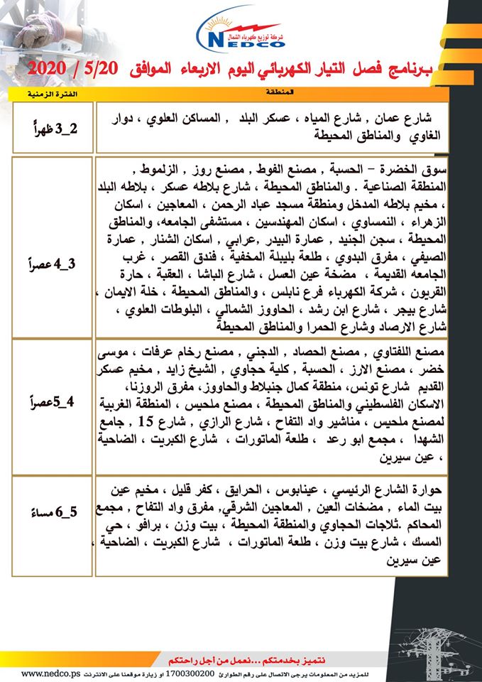 شركة توزيع كهرباء الشمال تنشر مواعيد ومناطق فصل الكهرباء في مدينة نابلس وضواحيها ليوم الأربعاء 20.05.2020، من الساعة 11 صباحاً لغاية الساعة 6 مساءً.