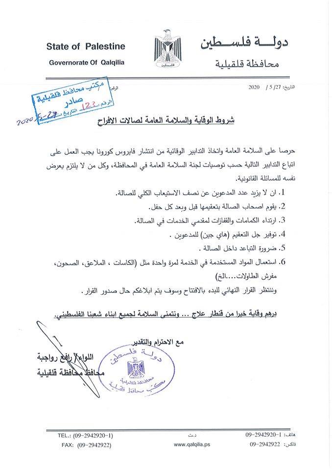 محافظة قلقيلية تصدر قرارات بخصوص إجراءات الوقاية في قاعات الأفراح وعدد المدعوين وارتداء الكمامات والكفوف لمقدمي الخدمات في القاعة.