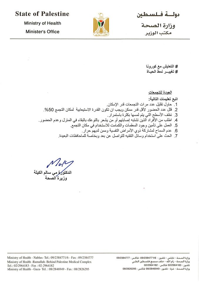 وزارة الصحة تنشر دليلاً للإجراءات الصحية المتعلقة بالوقاية من فيروس كورونا، من بينها إجراءات للوقاية في التجمعات.