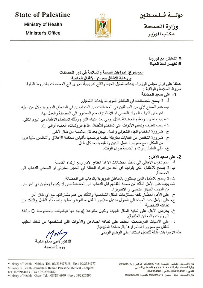 وزارة الصحة تنشر دليلاً للإجراءات الصحية المتعلقة بالوقاية من فيروس كورونا، من بينها إجراءات للوقاية في دور الحضانات ومراكز الأطفال الخاصة.