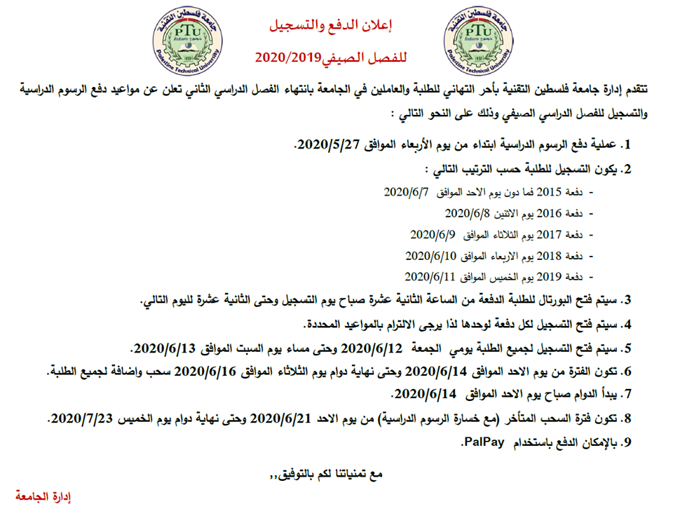 جامعة فلسطين التقنية خضوري تعلن عن مواعيد دفع الرسوم الدراسية والتسجيل للفصل الصيفي 2020.
