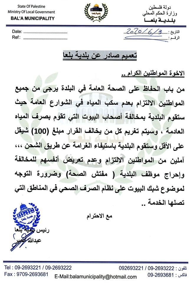 بلدية بلعا تحدد غرامة مالية لمن يخالف قرار عدم صرف المياه العادمة في الشوارع.
