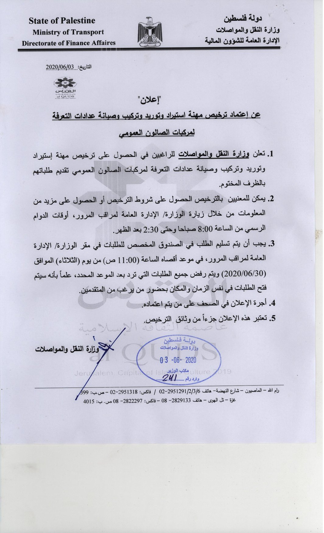 وزارة النقل والمواصلات تعلن عن فتح باب طلبات التقديم للراغبين في الحصول على ترخيص مهنة استيراد وتوريد وتركيب وصيانة عدادات التعرفة لمركبات الصاون العمومي.