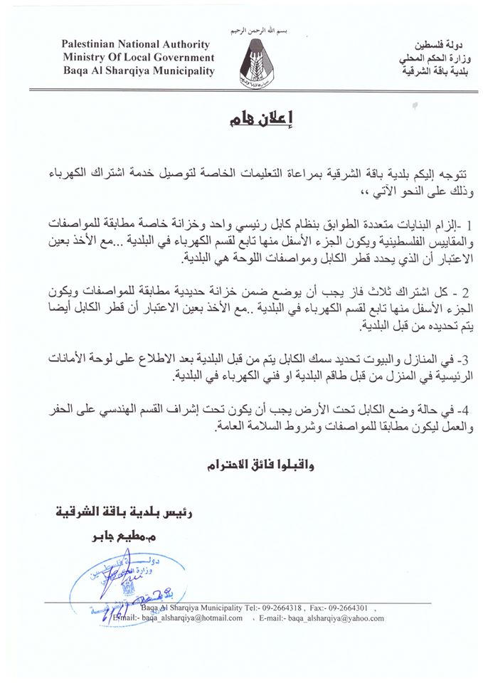 بلدية باقة الشرقية تنشر مجموعة من التعليمات بخصوص خدمة اشتراك الكهرباء.