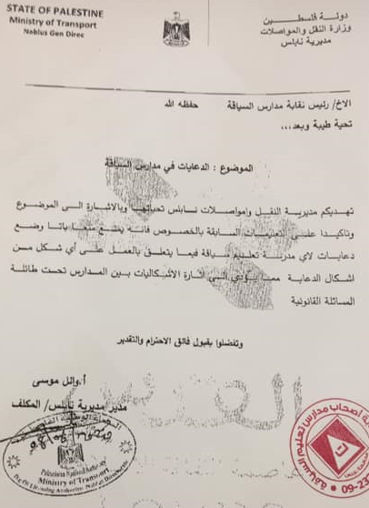 نقابة أصحاب مدارس السياقة في نابلس تعلن منع وضع دعايات.