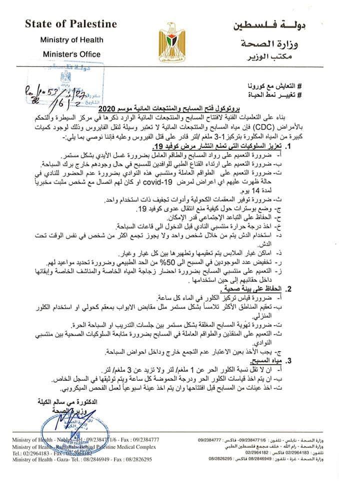 وزارة الصحة تؤكد أن مياه المسابح لا تعتبر ناقلة لفيروس كورونا وتنشر بروتوكولا وقائيا لاتباعه خلال ارتياد المسابح والمنتجعات المائية.