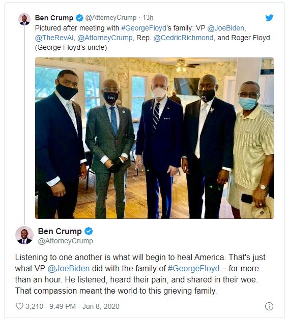 بايدن يزور عائلة فلويدفي غضون ذلك سافر المرشح الديمقراطي جو بايدن إلى هيوستن لتقديم العزاء بنفسه لعائلة الفقيد. ونشر محامي العائلة بنيامين كرامب على موقع توتير أن بادين "قضى مع عائلة فلويد أكثر من ساعة زمن وقدم عزاءه. ومواساته للعائلة المنكوبة يعني لك الكثير".
