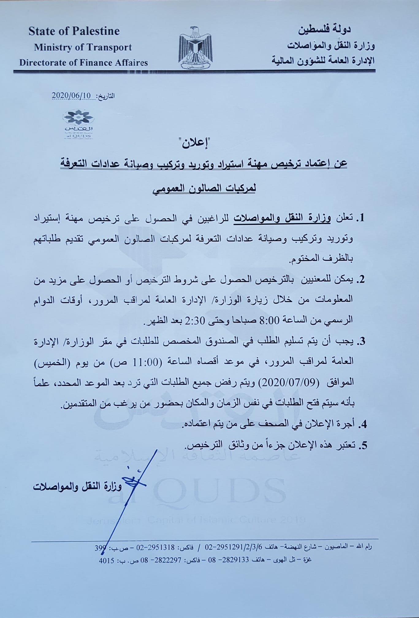 وزارة النقل والمواصلات تنشر إعلاناً بخصوص ترخيص مهنة استيراد وتوريد وصيانة عدادات التعرفة لمركبات الصالون العمومي.