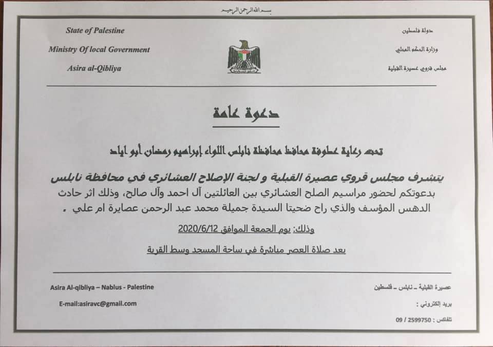 إثر حادث الدهس الذي راحت ضحيته السيدة جميلة عبد الرحمن، مجلس قروي عصيرة القبلية ولجنة الإصلاح العشائري في نابلس يدعوان لحضور مراسم الصلح العشائري بين العائلتين.