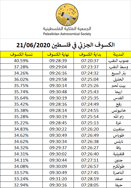 الجمعية الفلكية الفلسطينية تنشر أوقات بداية ونهاية ونسبة الكسوف الجزئي الذي ستشهده فلسطين صباح الأحد 21.06.2020.