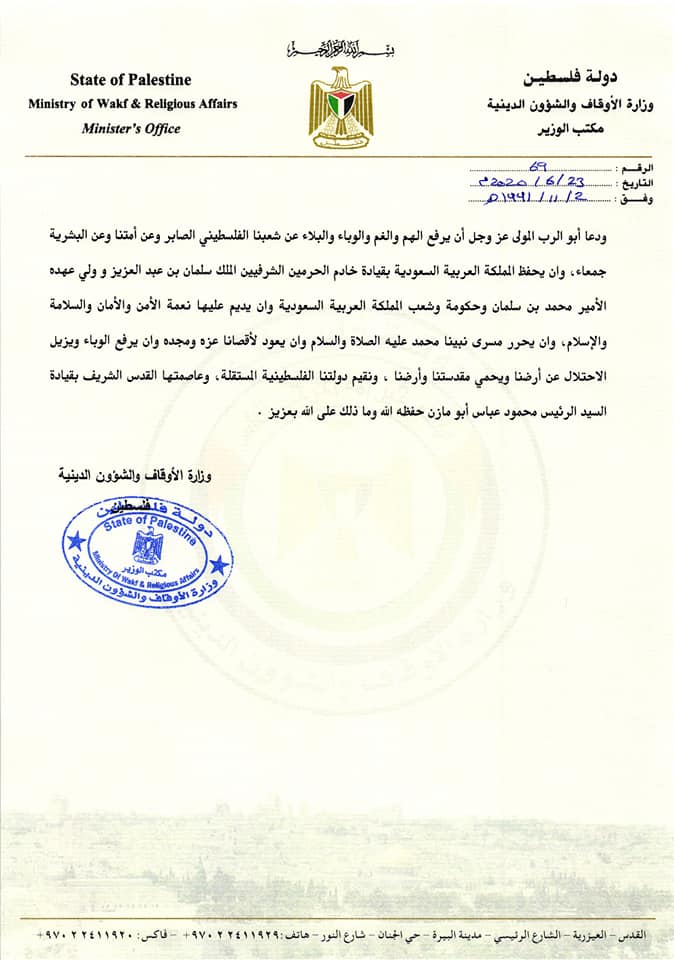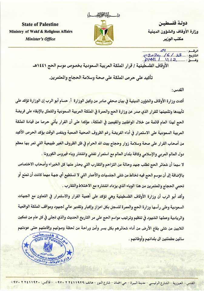 وزارة الأوقاف والشؤون الدينية تدعم قرار السعودية باقتصار آداء فريضة الحج على من هم بداخل المملكة وذلك لمنع تفشي فيروس كورونا.