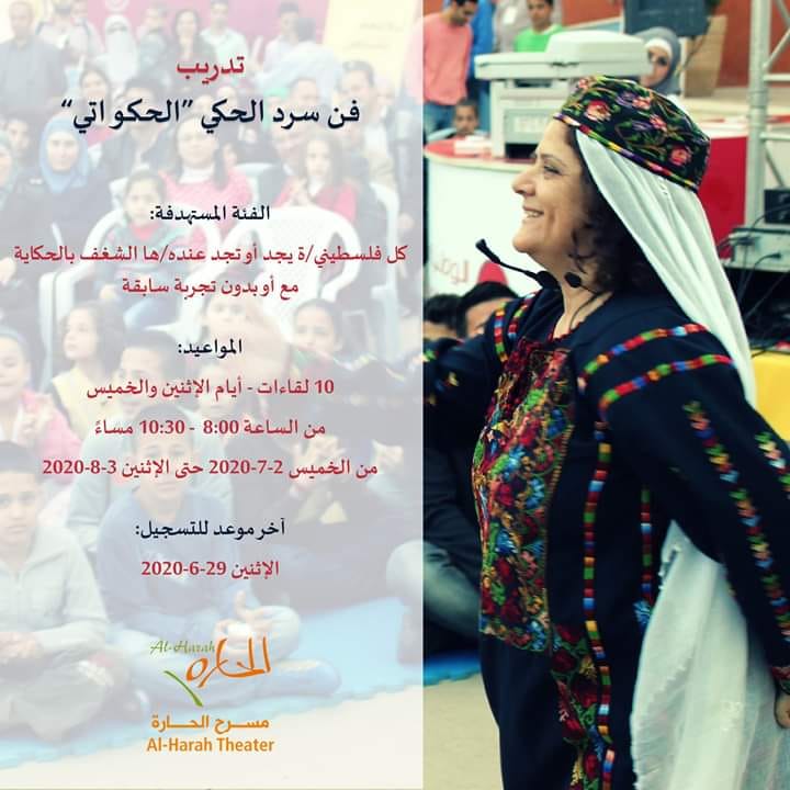 ينظم مسرح الحارة وبالتعاون مع الحكواتية الفلسطينية دينيس أسعد؛ وهي من أوائل الحكواتيين والمدربين في فلسطين، تدريباً في فن سرد الحكي "الحكواتي" عن بعد (Online).