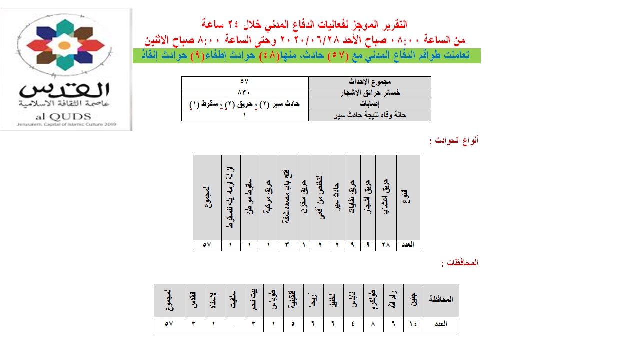 تعاملت طواقم الدفاع المدني مع 57 حادثاً ضمت 48 حالة حرائق و9 حالات تقديم مساعدة خلال يوم الأحد 28.06.2020.