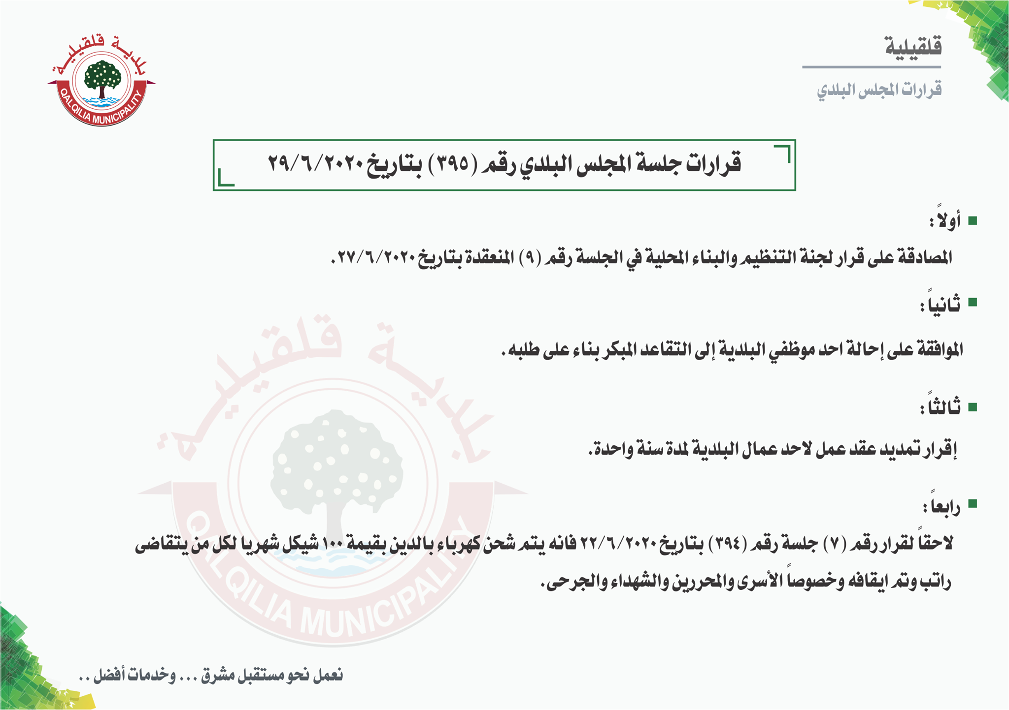 بلدية قلقيلية تنشر قرارات جلسة المجلس البلدي رقم 395 بتاريخ 29.06.2020.