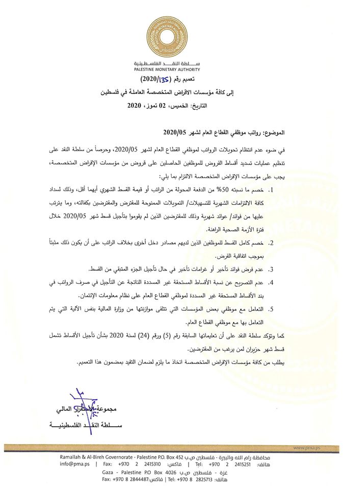 سلطة النقد تصدر تعميما لكافة المصارف ومؤسسات الإقراض المتخصص العاملة في فلسطين بخصوص رواتب موظفي القطاع العام.