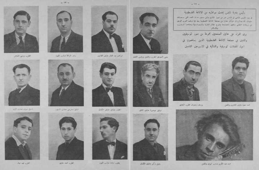 على صفحتين من العدد الرابع عشر من مجلة هنا القدس والصادر، الأحد 21 تموز 1940، وكان عدداً مخصصاً للاحتفاء بمدينة نابلس، نشاهد صور فناني وموسيقيي الإذاعة والذين سيحيون حفلات موسيقية وغنائية خلال الأسبوعين القادمين.