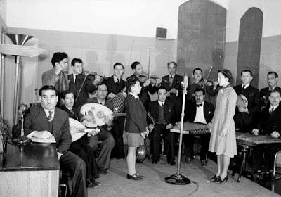 المطربة ماري عكاوي يقابلها الطفل الفنان فهد نجار في ستوديو دار الإذاعة الفلسطينية عام 1941