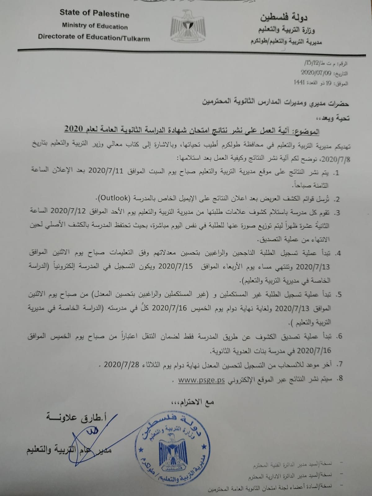 مديرية التربية والتعليم في طولكرم تنشر آلية نشر نتائج الثانوية العامة لعام 2020.
